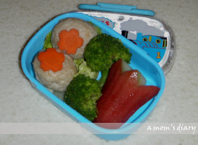 Homemade fishballs, broccoli florets and tulip rose apple.